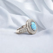 Indulge in pure elegance with our Opal Halo Ring. Crafted from 925 sterling silver, this captivating ring features a mesmerizing opal center stone surrounded by sparkling zircons in a halo design. The iridescent opal and dazzling stones exude luxury and sophistication, making it the perfect statement piece for any outfit.